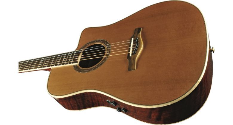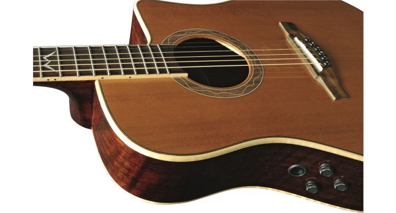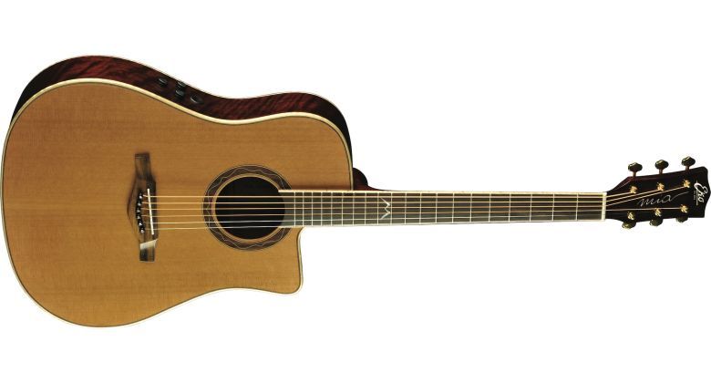 The MIA D400ce is the electrified acoustic guitar by Eko Guitars, with onboard Fishman Flex Blend system. Featuring a D cutaway shape with Solid Cedar Top, 3-ply laminated Ovangkol back and sides, Okoume neck and Rosewood fingerboard, this guitar is well suited for both live performances and studio recording.