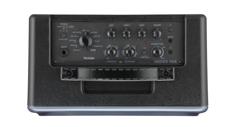 VX50-GTV je vybaveno lampou nové generace Nutube. Tahle elektronka, která využívá elektroluminiscenční technologii pro standardní použití jako klasická vakuová lampa, se již nachází v celé řadě výrobků VOX a dalších značek. Zkreslení a pocit komprese, které očekáváte od vakuových lamp, a dokonce i odezvu a herní pocit, to vše dokonale zachycuje pocit, jako když hrajete přes klasické vakuové lampy. Vedle nízké hmotnosti, které by nebylo možno s klasickými lampami dosáhnout, přináší Nutube i další výhody, jako třeba nulovou údržbu nebo nízkou pořizovací cenu.