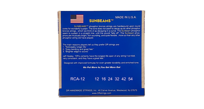 Struny Sunbeam jsou ručně vinuté na kulaté jádro, což poskytuje neskutečné výsledky… nádherný sustain… pozoruhodný sustain. Tón jako by se neztrácel, tak jako u ostatní fosfor bronzových strun, o kterých říkáme, že se ztrácí v křivce. Fosfor Sunbeam tón jakoby drží v v přímé lince, dokud zvuk „neupadne“. Fosforové struny Sunbeam jsou také muzikálně jasné a mají bohatý zvuk. Protože mají kulaté jádro, jsou také velmi flexibilní, daleko více, než jakékoli jiné struny, na které jste kdy hráli.