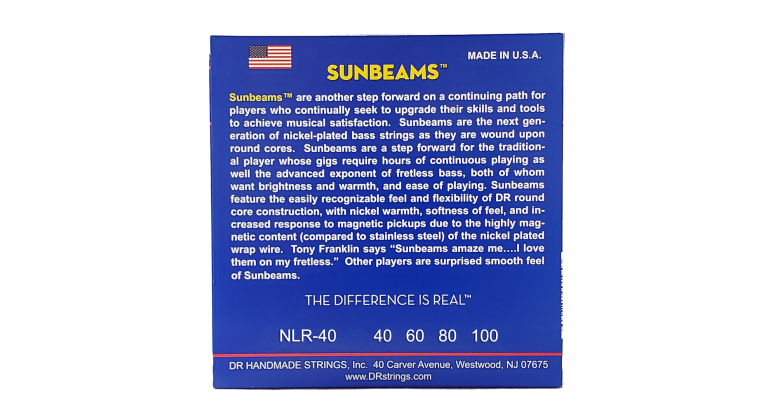 Struny SUNBEAMS™ jsou dalším krokem kupředu na nikdy nekončící cestě hráčů, kteří neustále zlepšují své dovednosti a hledají další možnosti, jak dosáhnout hudební spokojenosti. Struny SUNBEAM™ jsou poniklované struny nové generace, neboť jsou navinuty na kulatém jádru. Sunbeam jsou krokem kupředu po tradiční hráče i pro pokročilé uživatele bezpražcových baskytar, neboť obojí chtějí jasnost a vřelost. Tyto struny mají snadno rozeznatelný feel a flexibilitu DR konstrukce s kulatým jádrem, s niklovou vřelostí, měkkostí pocitu a vyšší odezvou na magnetické snímače díky citlivému magnetickému obsahu (v porovnání s nerezovou ocelí) poniklovaného vinutí.