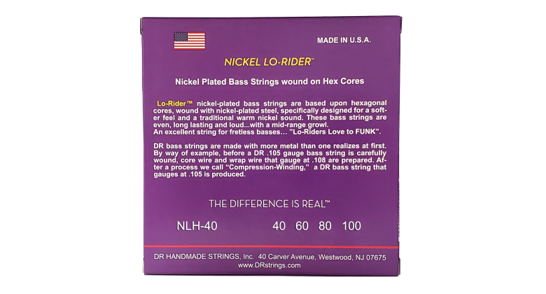 stránky DR StringsBasové struny Nickel Lo-Rider je speciálně zkonstruovány pro měkčí pocit a tradičně vřelý zvuk niklových strun. Tyto basové struny jsou vyvážené, mají dlouhou životnost a jsou hlasité, se středovým průrazem. Excelentní struny pro bezpražcové baskytary. „Lo-Riders milují FUNK.“