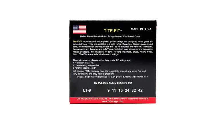 DR Strings používá jen ty nejlepší americké materiály – od drátu, přes ukončení, až po obaly. Když někdo vidí logo DR, dostane přesně tohle, to nejlepší ode všeho. Když na svoji kytaru natáhnete struny DR, nehledáte jen zvuk nových strun, ale chcete slyšet také něco nového, co jste předtím neslyšeli. A to je náš cíl… dát vám více.